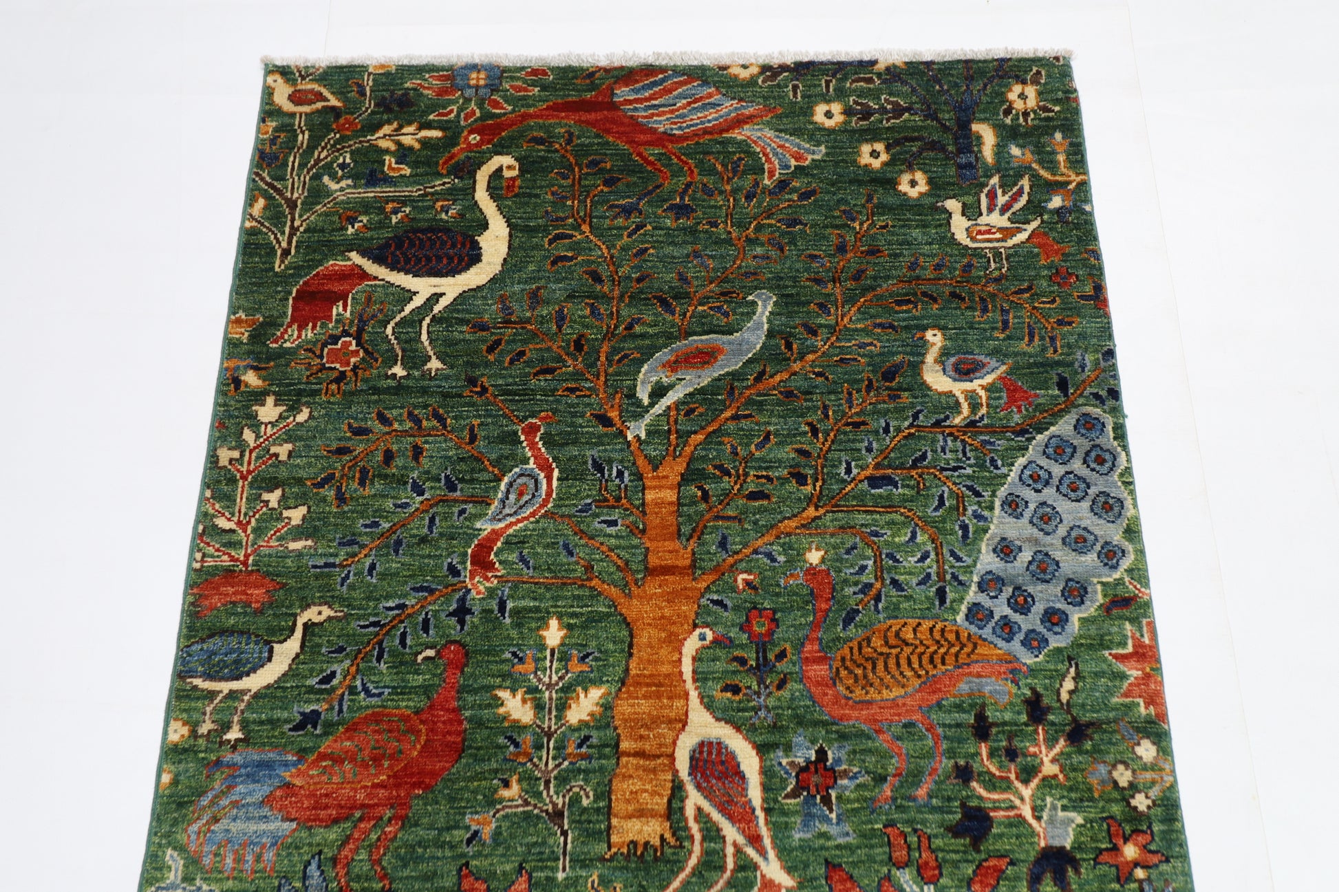 99 x 154 cm | Birds Green Afghan Tribal Hand Knotted Natural Veg Dye Wool Carpet