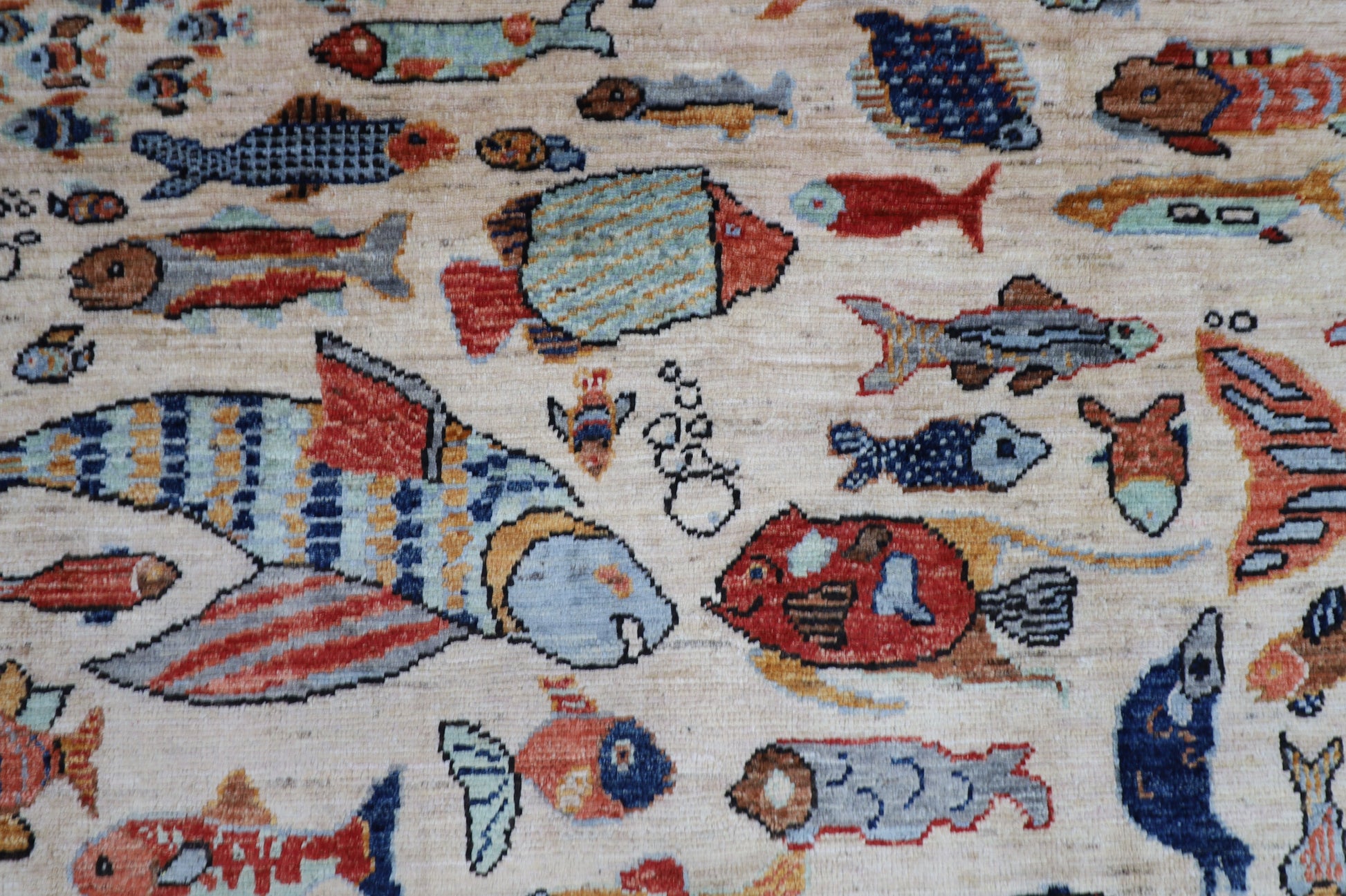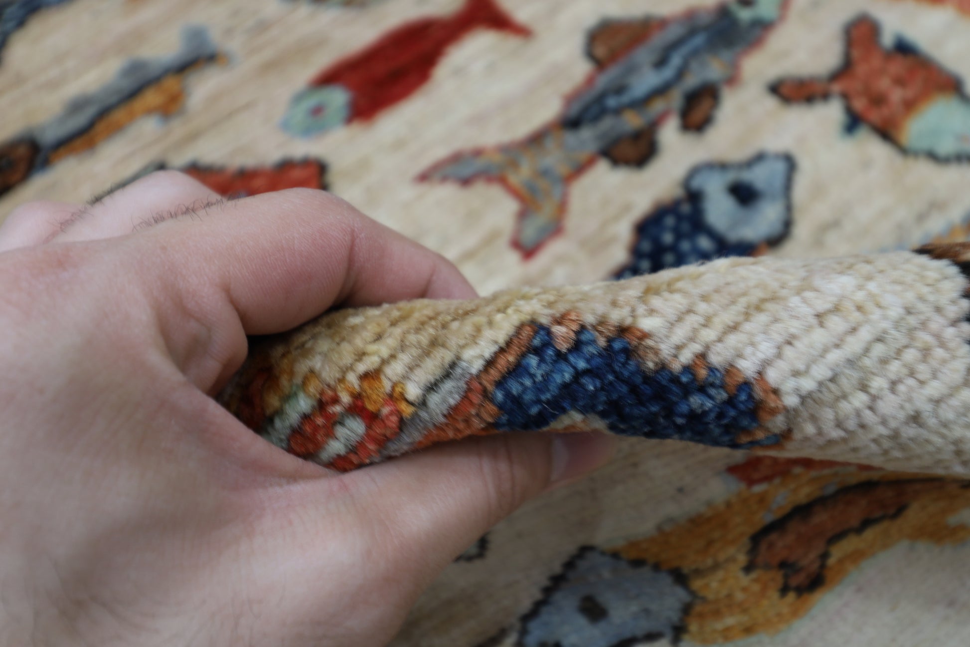 154 x 216 cm | Fish Party Afghan Tribal Hand Knotted Natural Veg Dye Wool Carpet