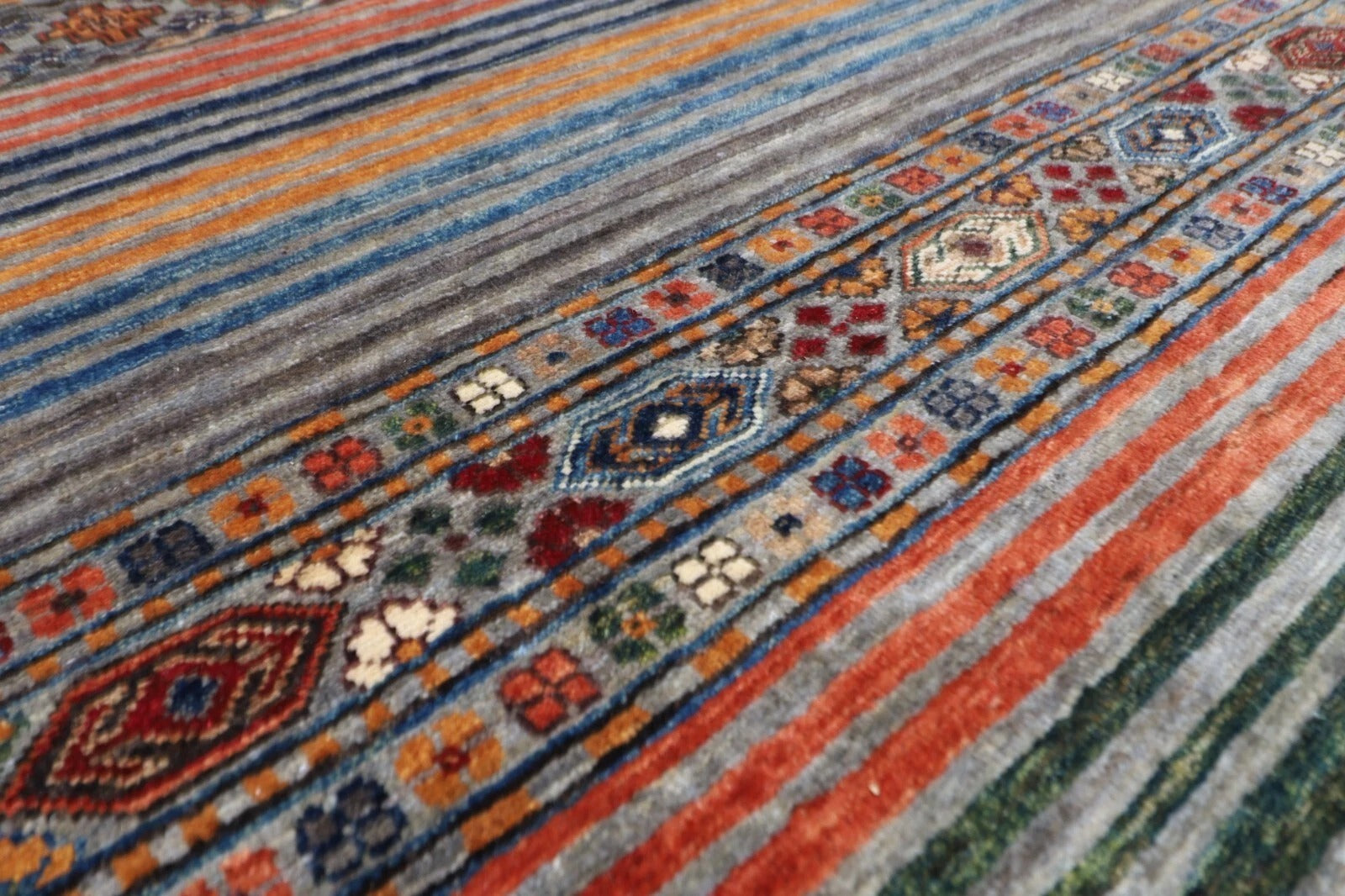 The photographs presented are captured indoor room lights without editing to show the beauty and vibrancy of the rug and also to give you the better idea that how the rug will look in your room and office, the colors in the rug will be perceived differently depending on the angle you view it from.
