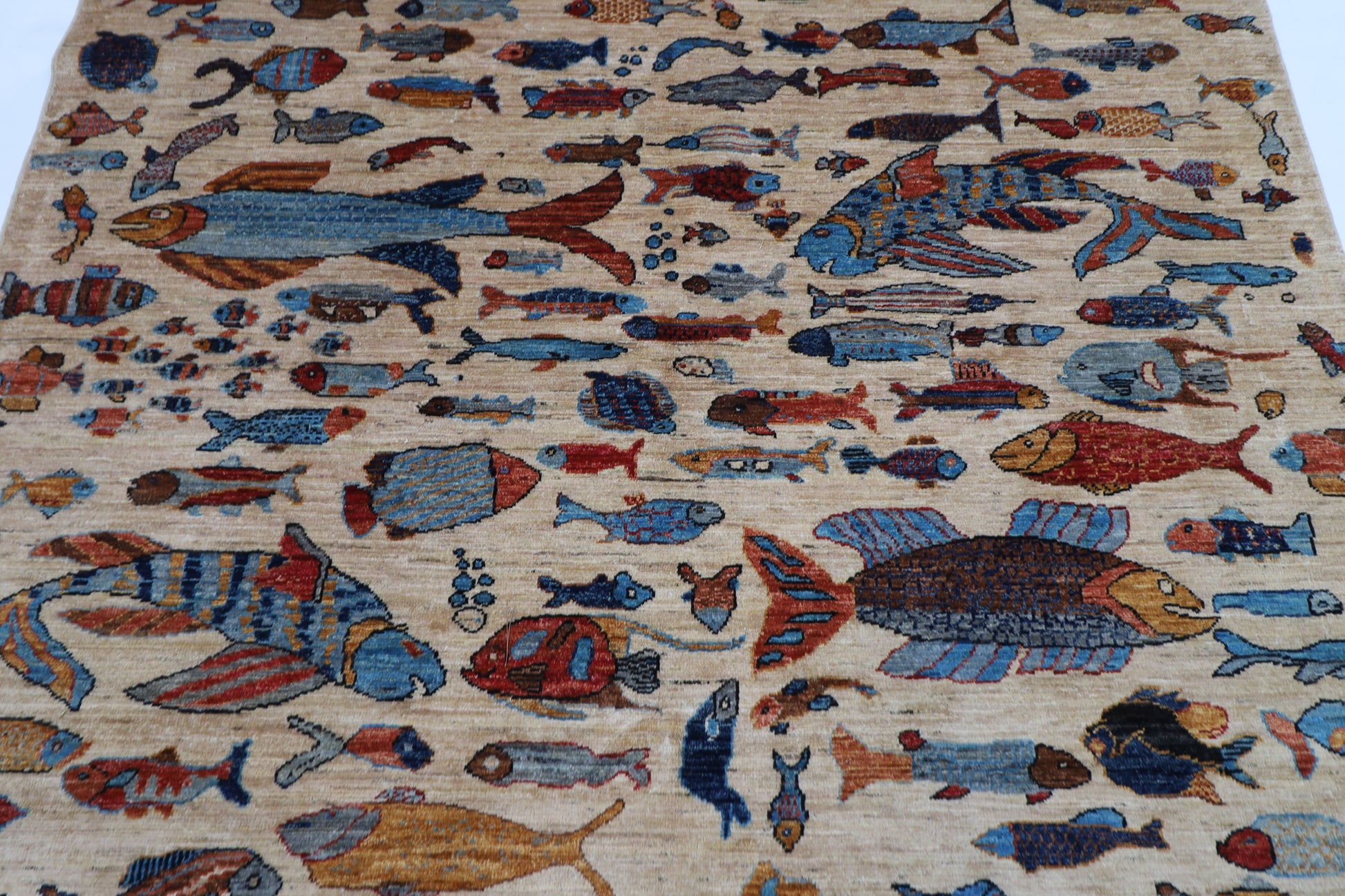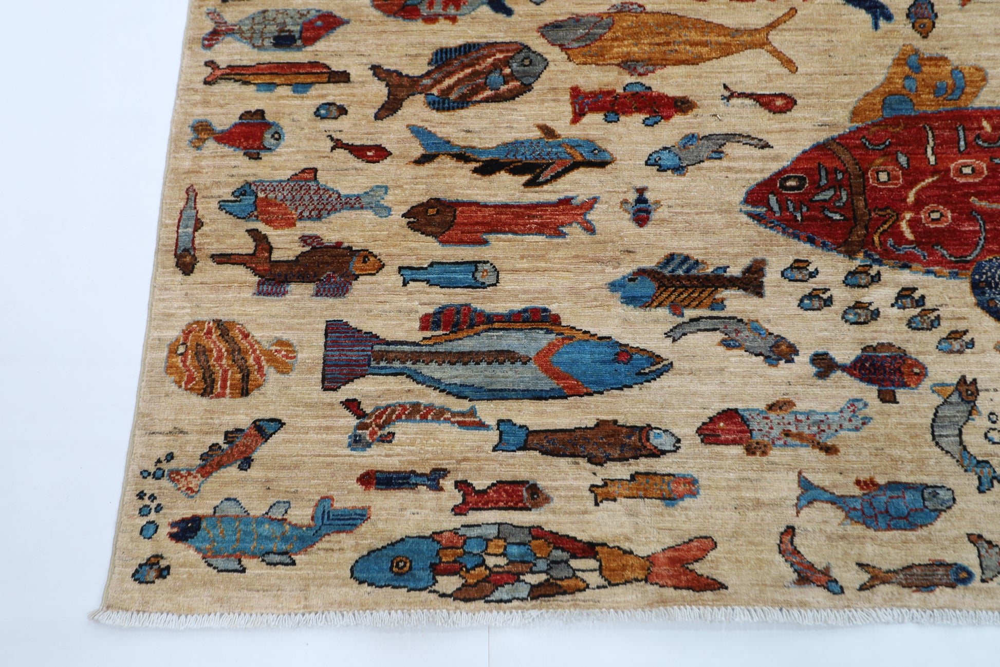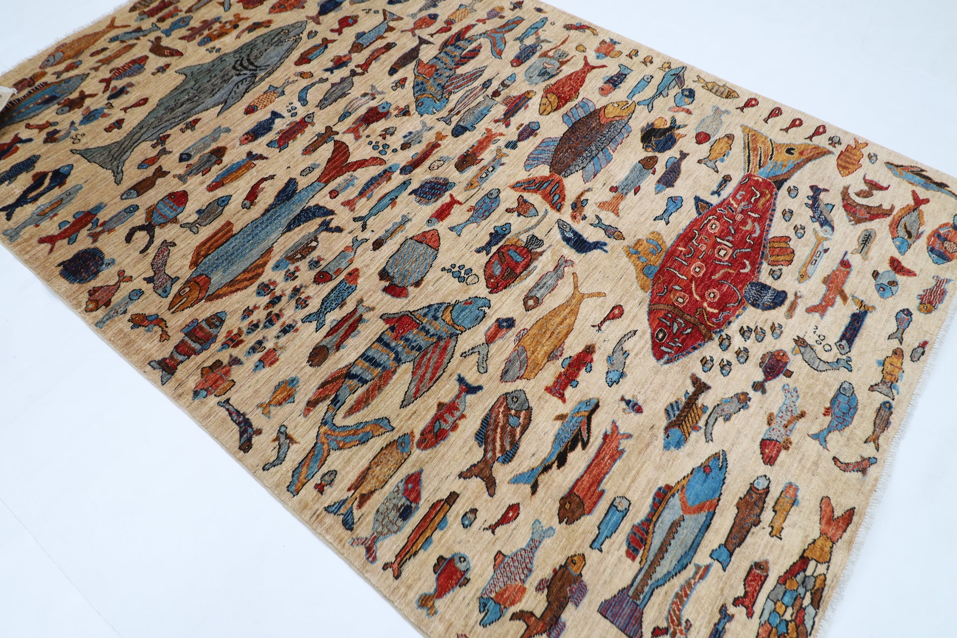 180 x 273 cm | Fish Party Beige Afghan Hand Knotted Carpet