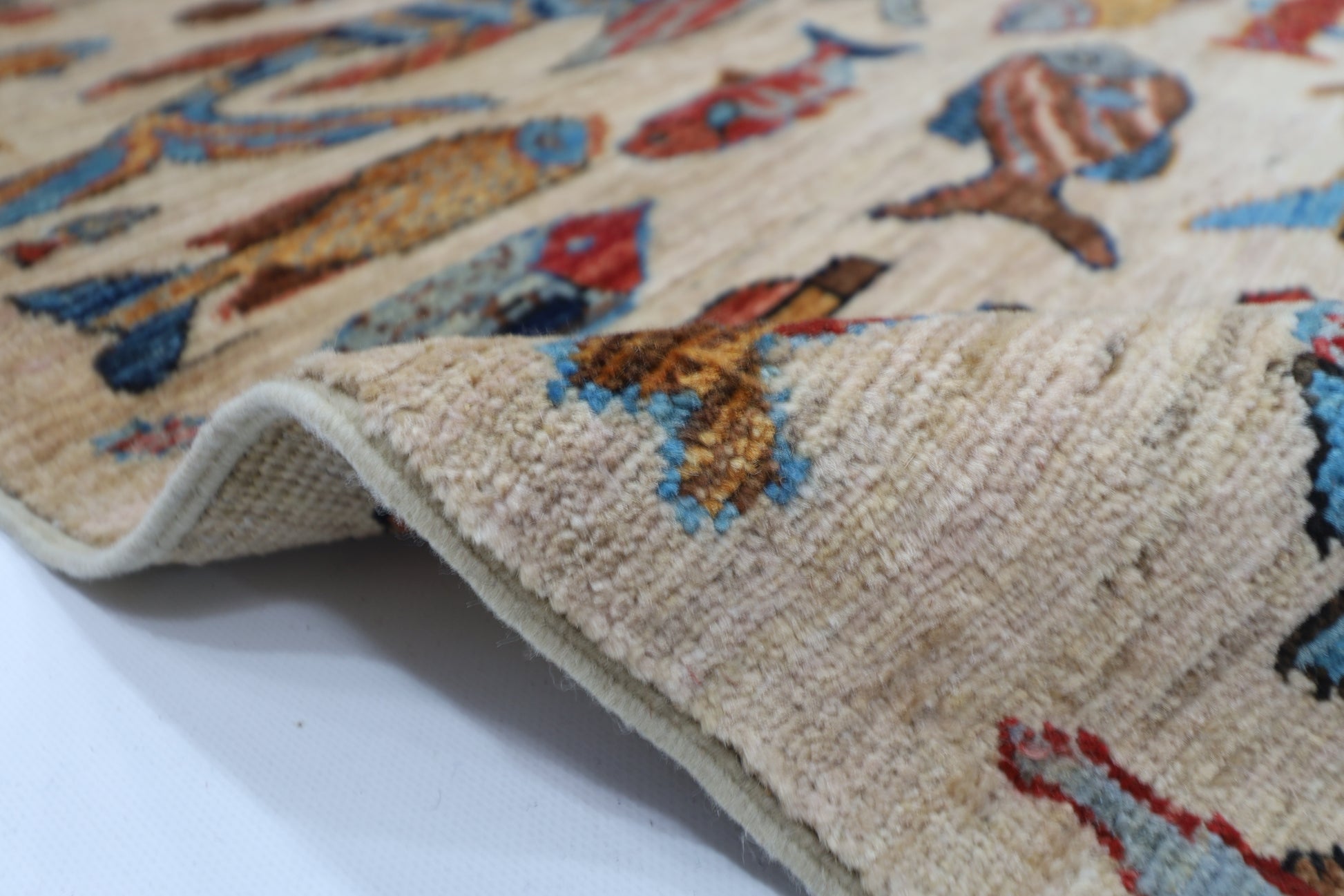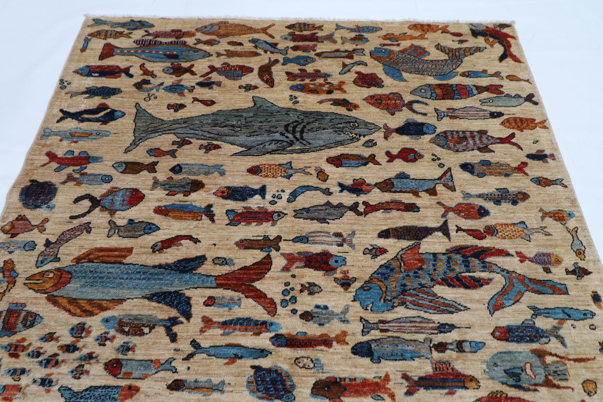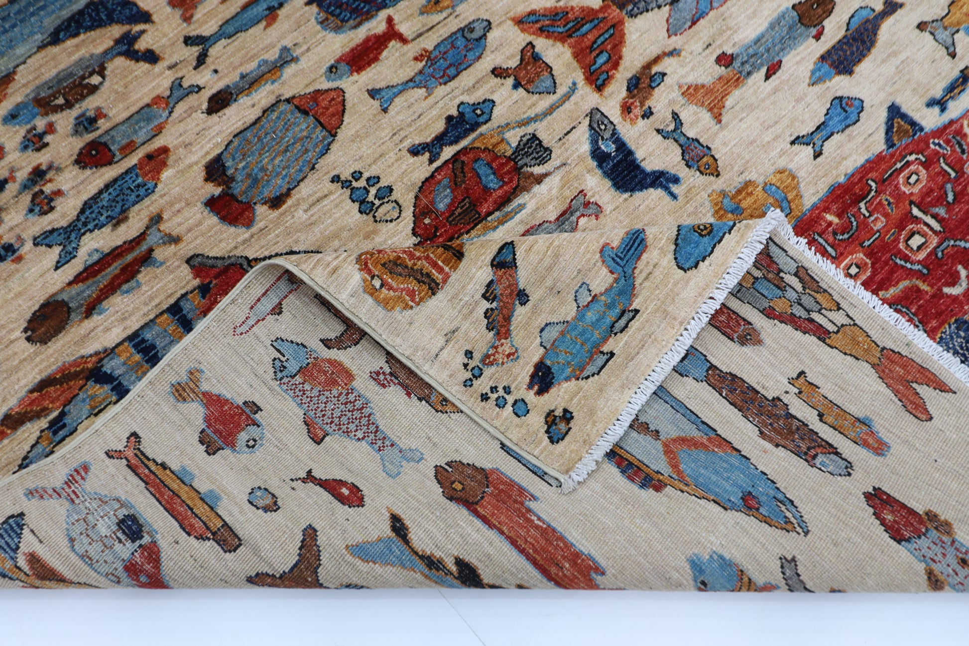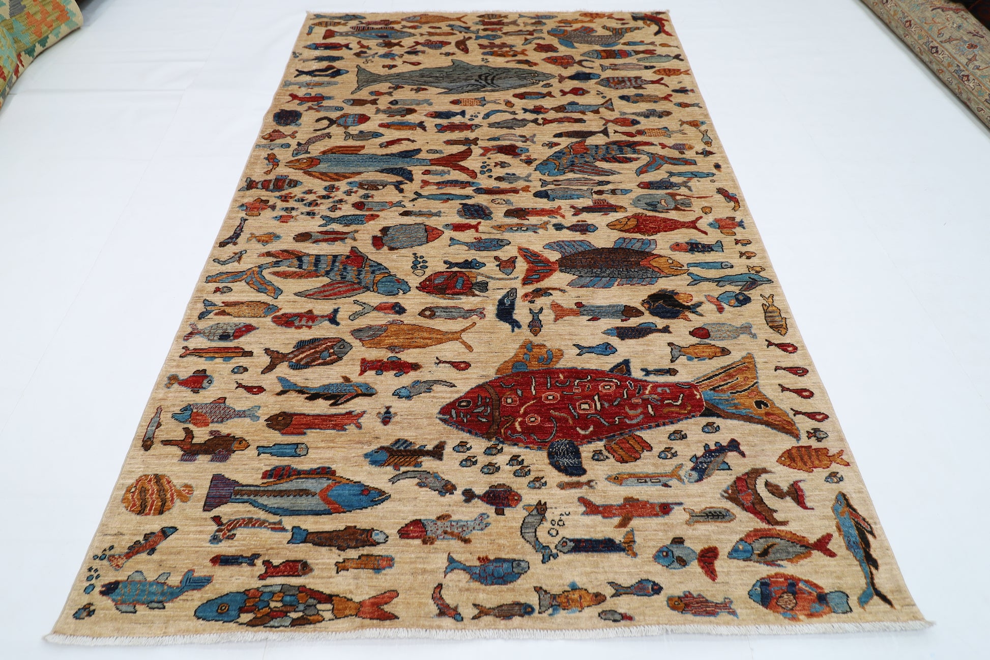 180 x 273 cm | Fish Party Beige Afghan Hand Knotted Carpet