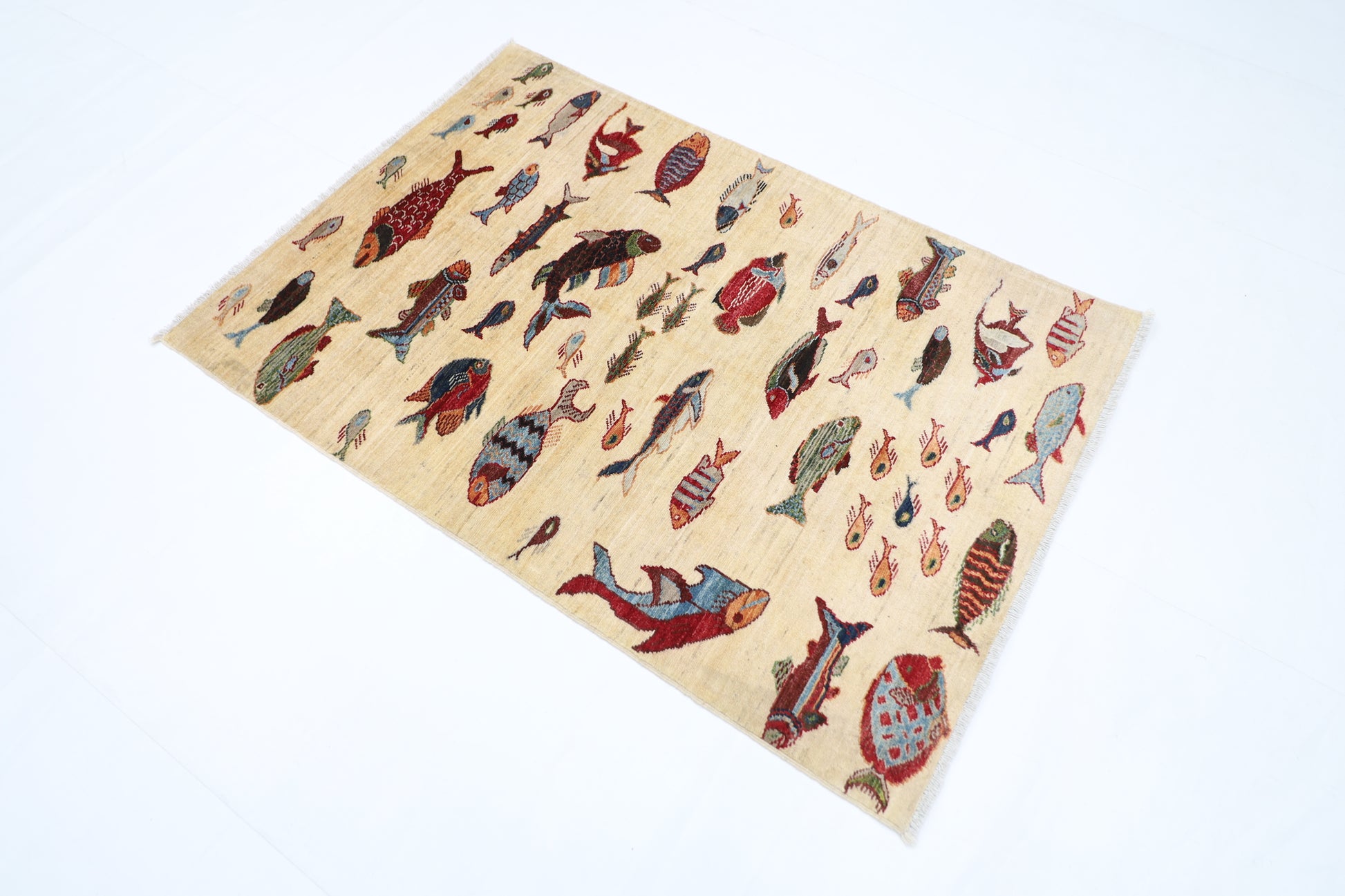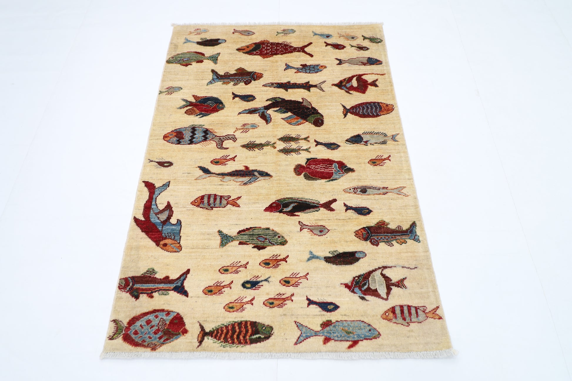 104 x 150 cm | Fish Party Afghan Tribal Hand Knotted Veg Dye Wool Carpet