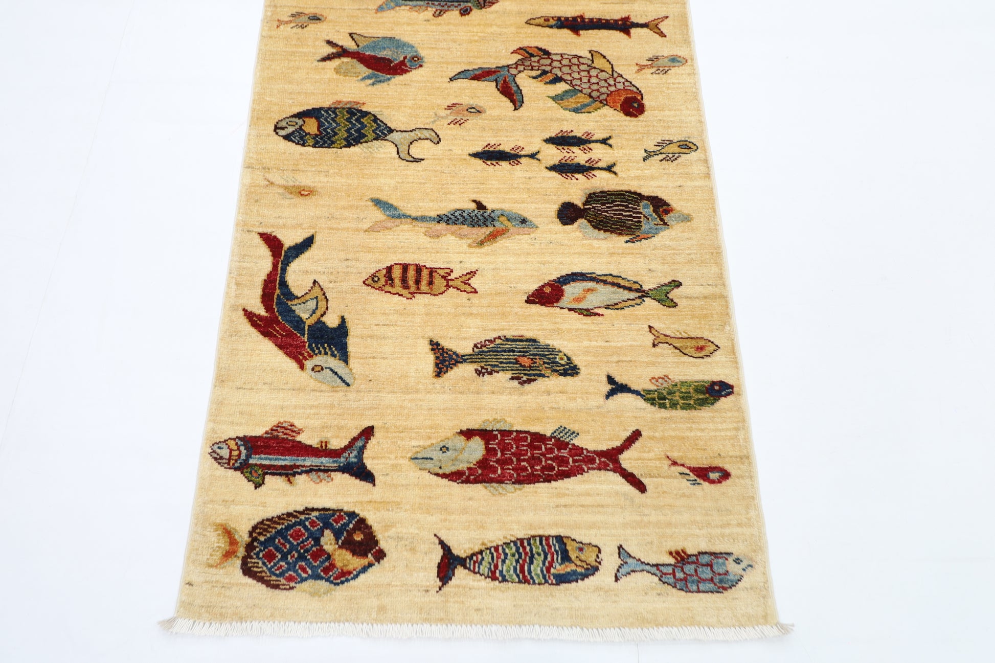 83 x 345 cm | Beige Fish Party Afghan Tribal Hand Knotted Veg Dye Wool Runner